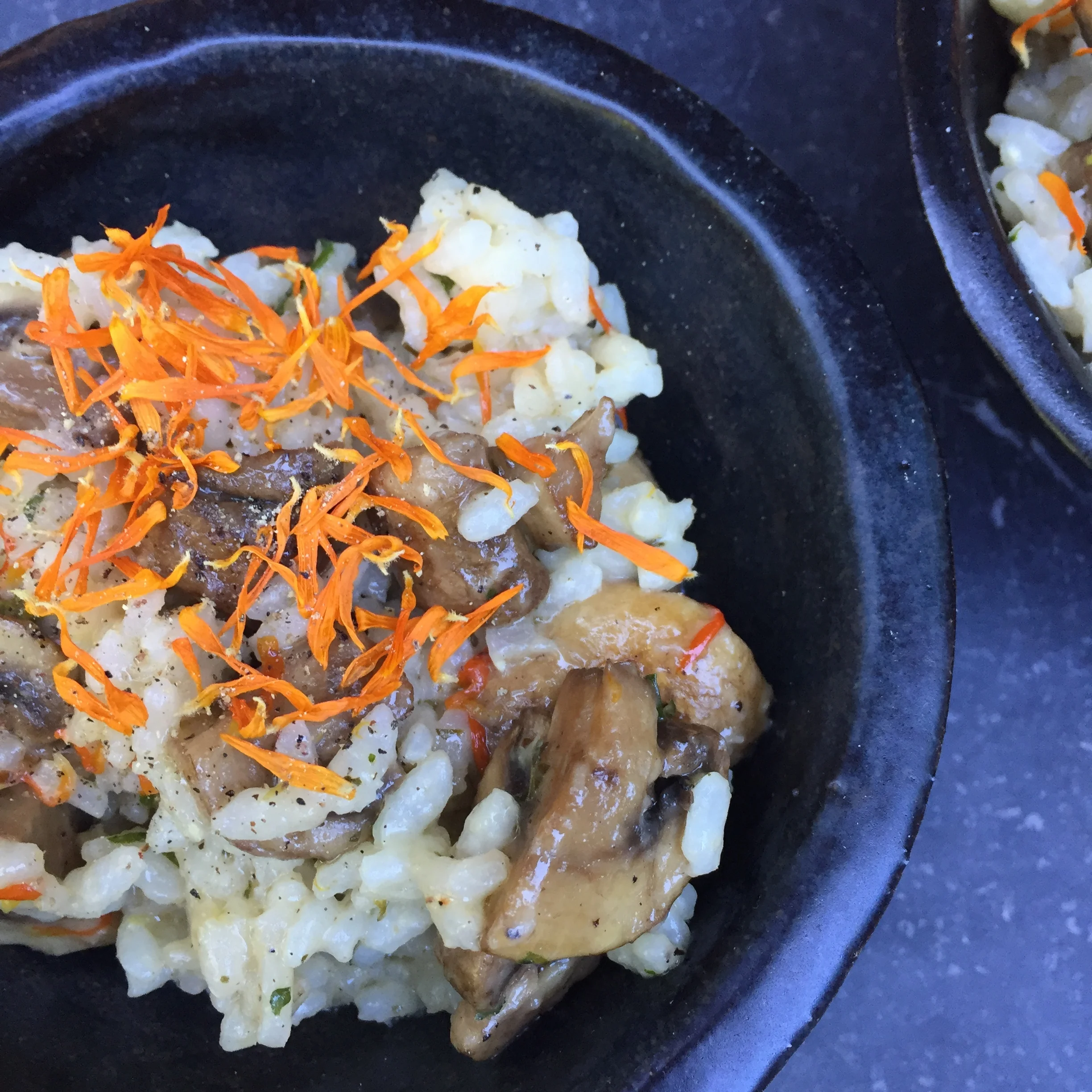 ![MUSHROOM RISOTTO WITH DRIED CALENDULA PETALS]()